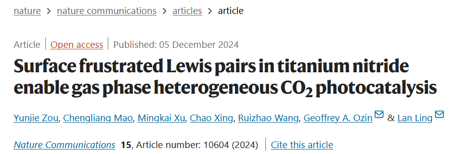 2024年12月5日,环境科学与工程学院的凌岚教授研究团队在国际学术刊物《nature communications》上发表了题为“Surface frustrated Lewis pairs in titanium nitride enable gas phase heterogeneous CO2 photocatalysis” 的研究成果;第一作者为我院直博生邹云杰;多伦多大学和同济大学为共同通讯单位,多伦多大学的Geoffrey A. Ozin教授和同济大学的凌岚教授为论文的共同通讯作者,同济大学为第一通讯单位。