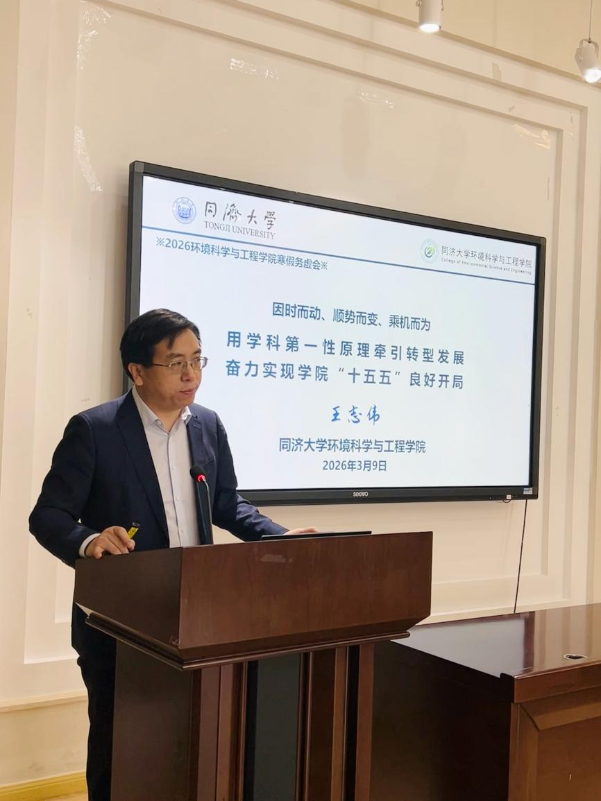 王志伟院长以《用学科第一性原理牵引转型发展,奋力实现学院“十五五”良好开局》为题作主题报告,重点传达了学校寒假务虚会精神,系统介绍了学院“十五五”发展规划的总体思路和重点任务,并以“第一性原理变迁”为主线,阐释了环境学科发展的底层逻辑、发展逻辑和内涵逻辑,指出了环境学科未来的疆域变化及人才培养方向调整。他强调,希望通过本次务虚会形成共识,凝聚共思,谋划共为,并转化为学院2026年重点工作举措和具体方案,为“十五五”开好局、起好步。