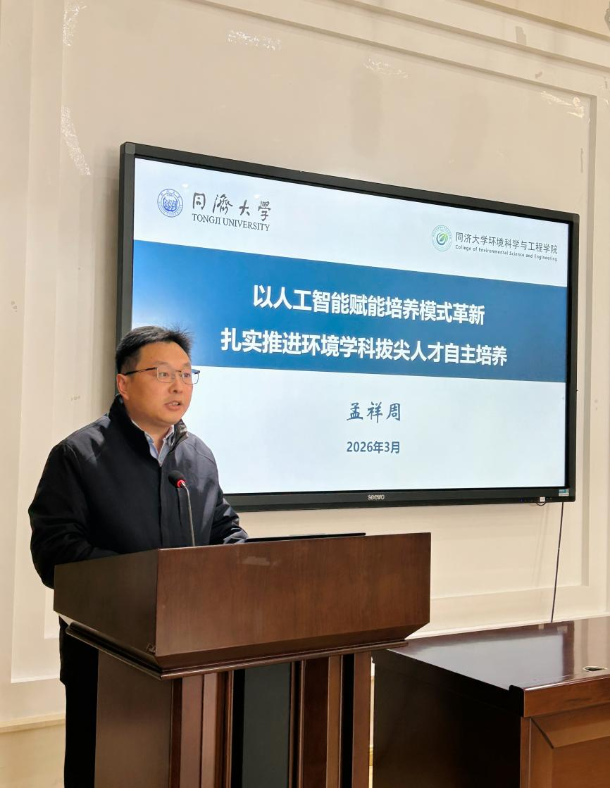 孟祥周副院长作题为《以人工智能赋能培养模式革新,扎实推进环境学科人才自主培养》的主题报告,分析了学院当前在人才培养方面的主要痛点,提出要以人才培养方案的修订为契机、以人工智能为抓手实现人才培养的“价值重塑”与“范式创新”,彰显同济环境人才培养的特色与优势,助力学校拔尖创新人才培养体系建设,并介绍了本年度将推进的生态环境大模型建设、智慧助教开发等重点任务。