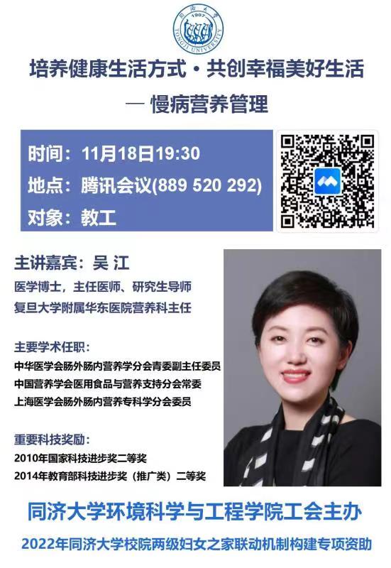 11月18日,我院工会组织了一场主题为“培养健康生活方式 共创美好生活——慢病营养管理”的健康知识讲座。邀请了复旦大学附属华东医院营养科主任、医学博士、主任医师吴江为大家进行了系统讲授。