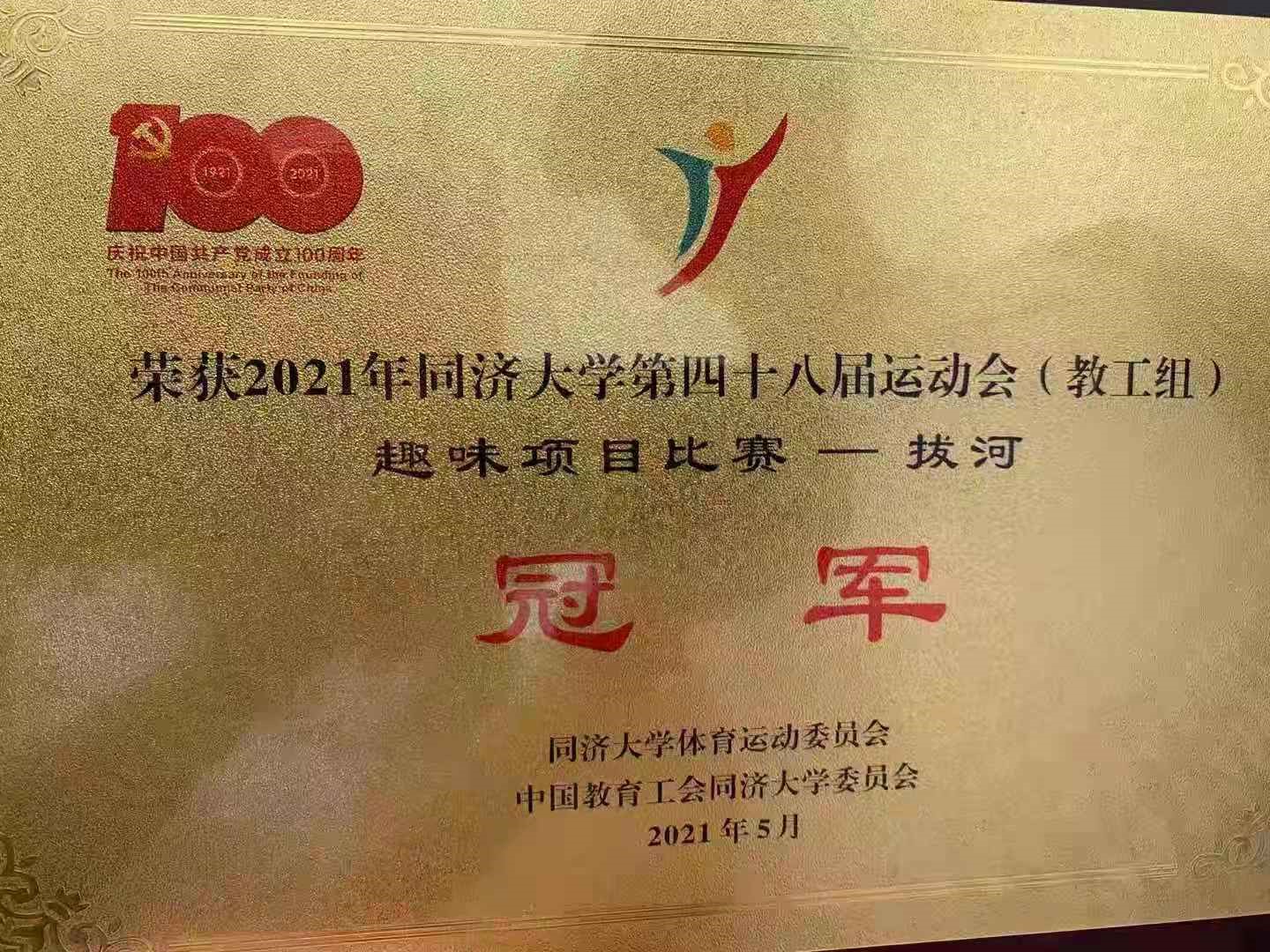 2021年5月15日,同济大学第四十八届运动会(教工组)拔河项目决赛在129篮球场顺利举行。环境学院拔河队由来自各系所十名男教工、四名女教工组成。经过预选赛、半决赛、决赛的层层比拼,我院拔河队分别战胜了机关队、后勤队和经管队多支劲旅,最终荣夺2021年同济大学运动会拔河冠军。