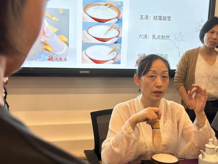 现场点茶环节,在冉玲老师的指导下,教工们首先将筛过后细腻的茶粉投入茶盏中,再用沸水冲点,随即用茶筅快速击打,使茶与水充分交融并茶盏中出现大量白色茶沫。活动中,教工们对点茶的每一步都兴致满满,有的老师还利用茶粉在白色茶沫上描绘图画,收获了更多乐趣。