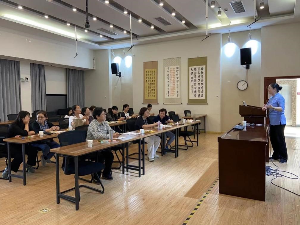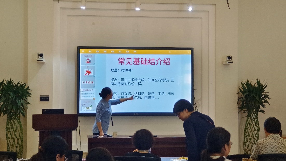 褚楚老师以生动的故事、幽默的话术介绍了中国结历史、样式以及历代中国结传承人对中国结文化的贡献,着重介绍了双钱结、十字结、盘长结,八字结,凤尾结、藻井结、团锦结等不同样式的特点和寓意,并展示了中国结饰品在日常生活中的运用。褚老师的讲解引人入胜,有教工不时拿出手机记录演示讲义上的内容。