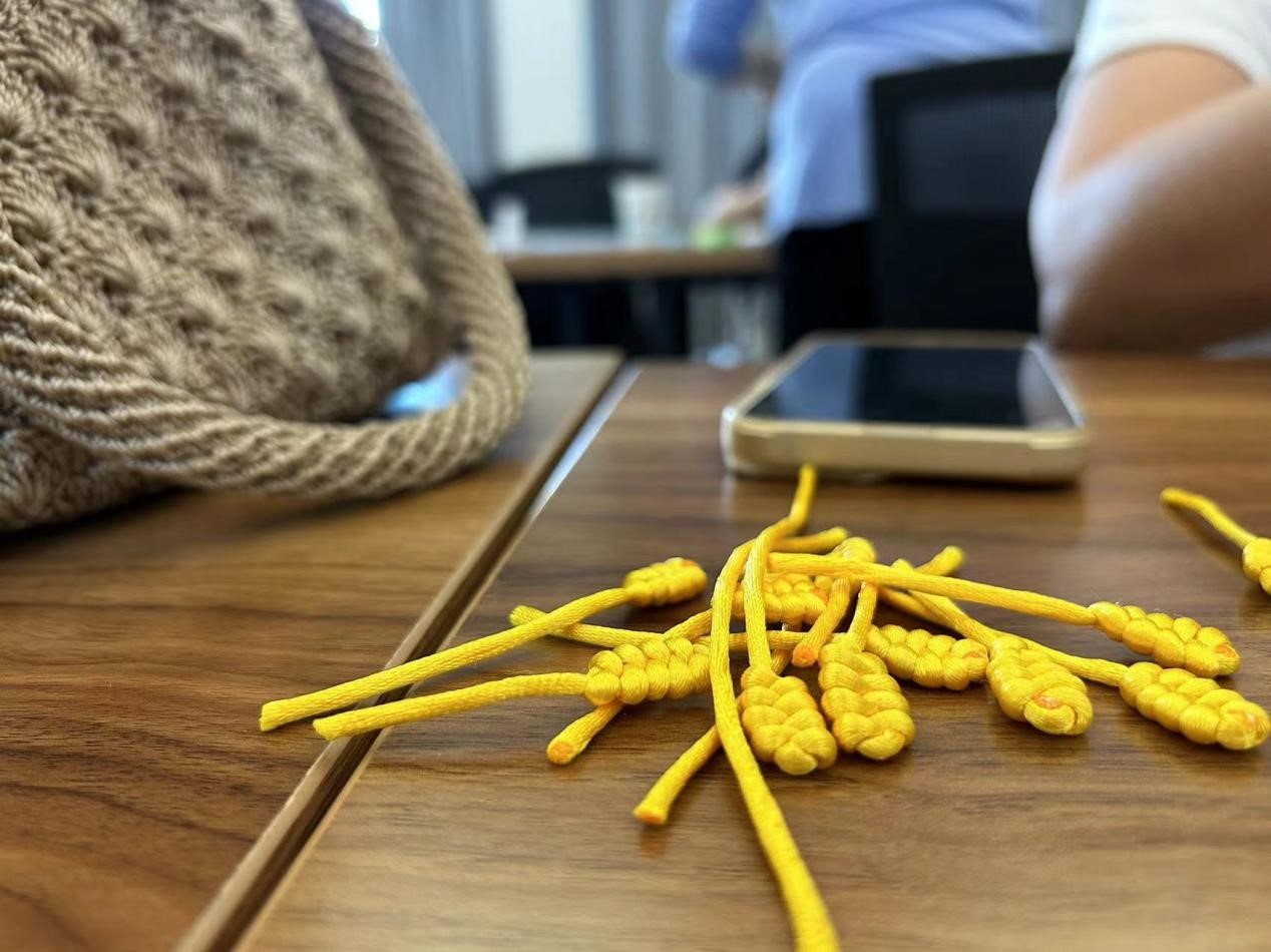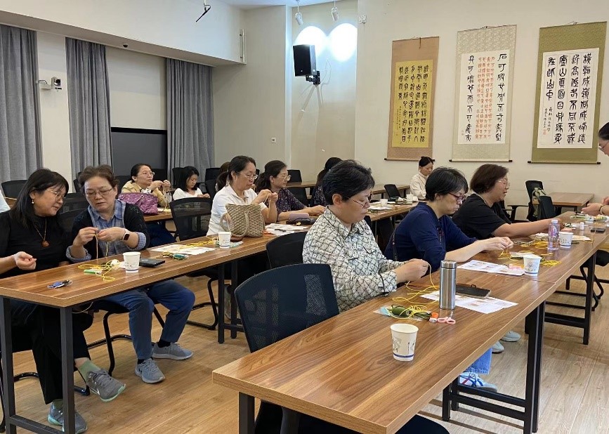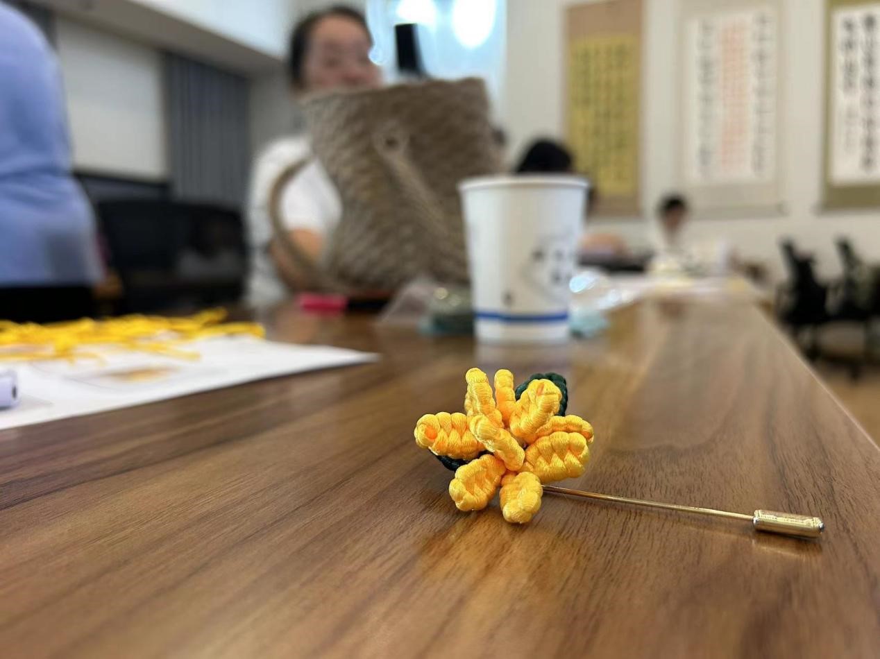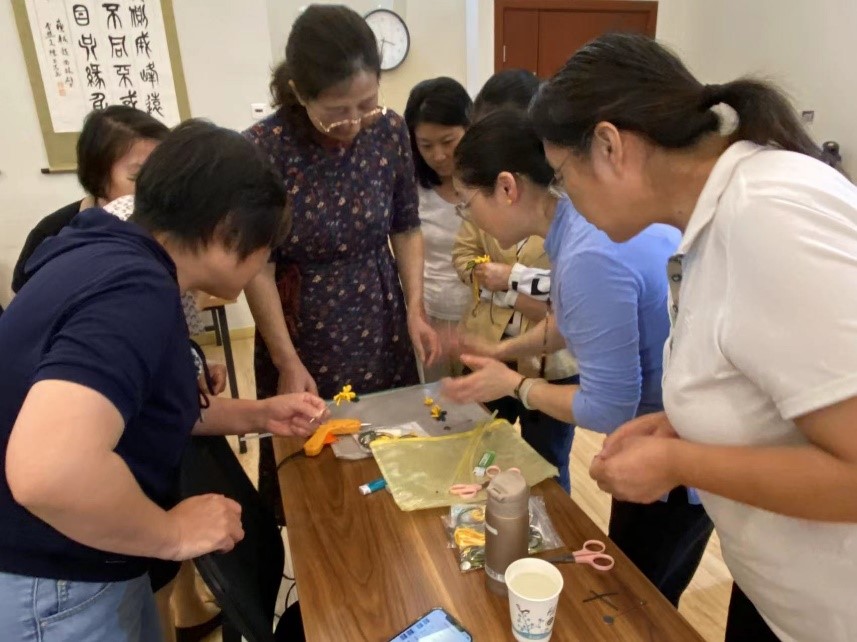 在动手实践环节,褚老师准备了中国结编织方法的教学视频,并对其中几个操作要点示范讲解。教职工动手操作,传艺人在此过程中四处走动,观察并指导每个人的制作。