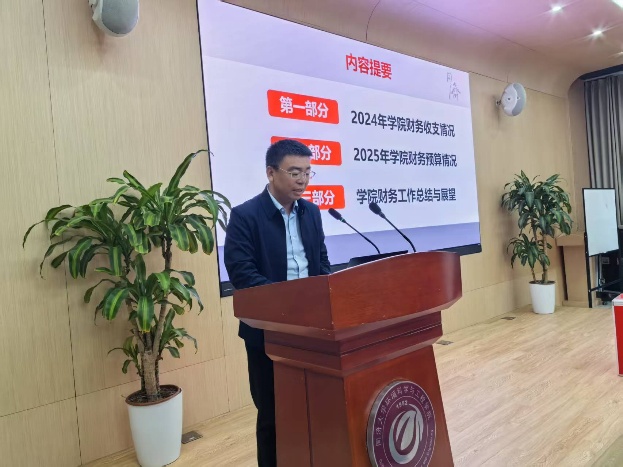 大会在庄严的国歌声中拉开帷幕。会议听取并审议了院长王志伟所作的《2024年度学院工作报告》、副院长吴德礼所作的《2024年度财务收支情况报告》,以及院工会主席周上玖关于《2024年度教代会提案落实及工会重点工作》的专题汇报。